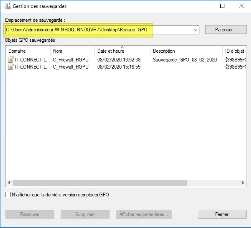 - Cela ne restaure pas les liaisons de la GPO - il faudra recréer les liens manuellement
