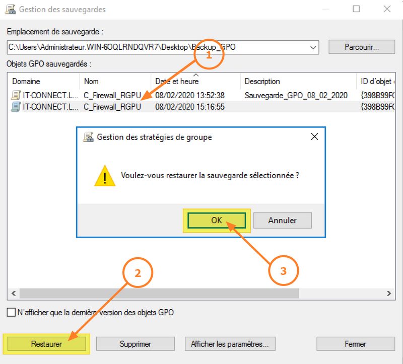 Note : si la GPO n'existe plus dans votre infrastructure, elle sera créée. Si elle existe toujours, elle sera écrasée pour revenir à l'état antérieur.