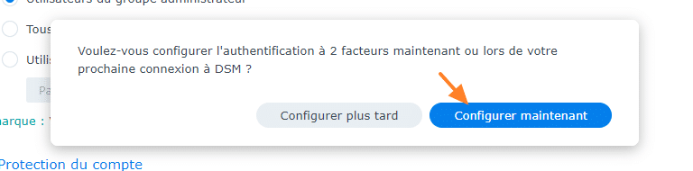Donc, une fois que vous avez fait votre choix, il ne reste plus qu'à sauvegarder via le bouton "Appliquer". À ce moment précis, DSM va vous proposer de configurer le MFA dès maintenant sur votre compte. Soyons fous et cliquons sur "Configurer maintenant".