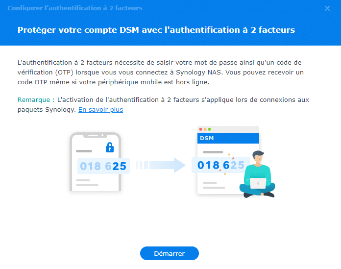 Un assistant se lance... Et on commence par vous rappeler que pour vous connecter sur le NAS, il faudra saisir votre mot de passe et le code d'authentification à usage unique généré par l'application sur votre smartphone. Cliquez sur "Démarrer".