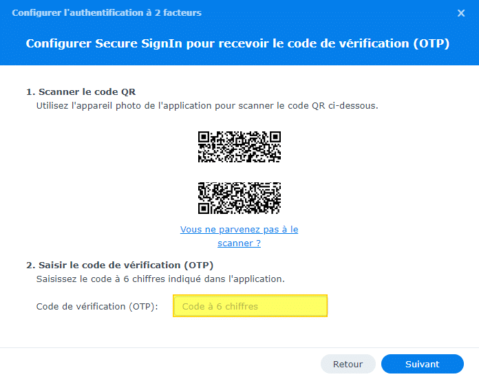 Pour générer ce code à usage unique, vous devez utiliser une application compatible : Synology Secure SignIn, Google Authenticator, Microsoft Authenticator ou encore FreeOTP. En fait, vous n'êtes pas obligé d'utiliser Synology SignIn, mais vous pouvez utiliser une application équivalente que vous utilisez déjà. En fait, le code QR qui s'affiche à l'écran sert à ouvrir le store afin de télécharger l'application Synology donc vous pouvez cliquer sur "Suivant" sans forcément scanner le code.