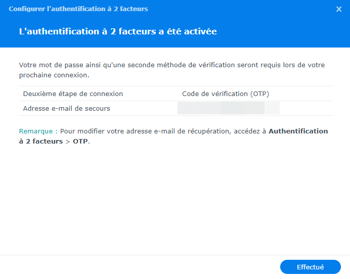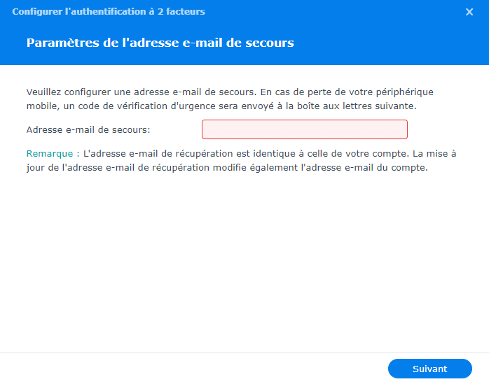 À l'étape suivante, vous devez définir une adresse e-mail de secours sur laquelle sera envoyé un code de secours dans le cas où l'application mobile est défaillante, ou que votre mobile est inaccessible. Autrement dit, c'est très important pour avoir une solution de secours et ne pas perdre l'accès à son compte. À ce sujet, voici ce que dit Synology : "Si vous perdez votre périphérique jumelé ou que vous n'y avez pas accès, vous pouvez tout de même vous connecter à votre compte à l'aide du code de vérification d'urgence envoyé à cette adresse e-mail de secours."