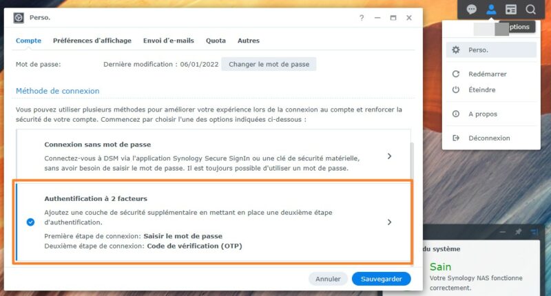 Pour améliorer la sécurité, il est recommandé d'utiliser l'authentification à 2 facteurs (ou l'authentification sans mot de passe) sur tous les comptes où cela est possible. En effet, selon les usages, vous pouvez rencontrer des contraintes (par exemple : un logiciel qui se connecte sur le partage du NAS pour stocker des données ne prendra pas toujours en charge le MFA).