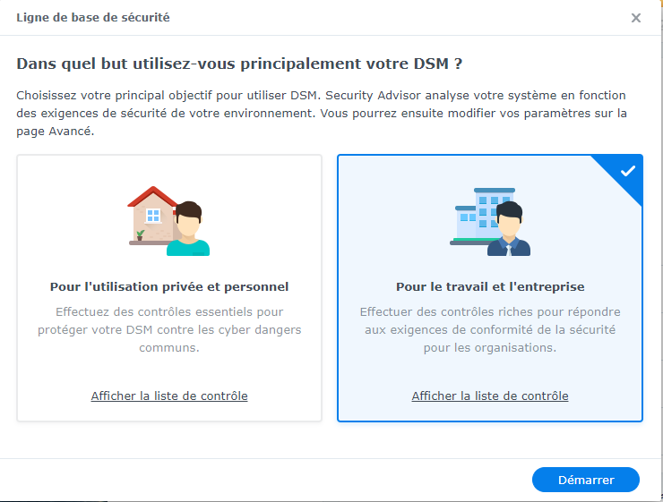 Ensuite, et dans le but d'établir un profil de sécurité sur votre NAS, choisissez si vous l'utilisez à titre privé ou pour le travail, puis cliquez sur "Démarrer.