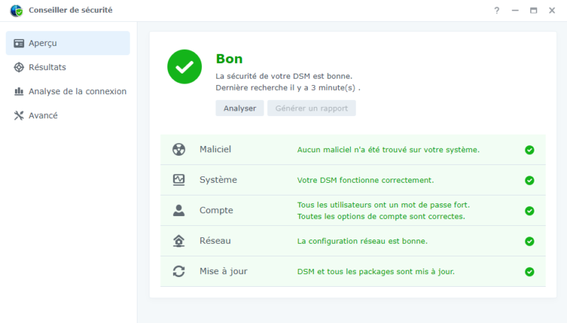 Le conseiller de sécurité va comparer les bonnes pratiques en matière de sécurité avec la configuration actuelle du DSM. Si l'on a bien travaillé, tous les feux devraient être au vert : ce qui est le cas ! J'espère que vous n'en avez jamais douté ! 😉
