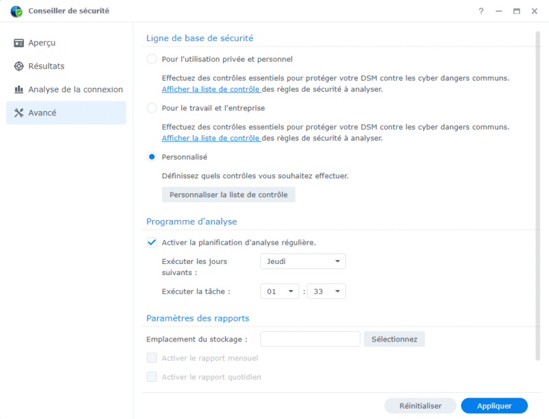 En ce qui me concerne, j'ai pris la décision de vous présenter le conseiller de sécurité à la fin de ce cours sur la sécurisation d'un NAS Synology, mais j'aurais pu aussi commencer par lui au tout début, afin de faire un avant/après. Néanmoins, cette analyse de fin devrait vous rassurer et mettre en évidence les éventuelles règles que vous auriez pu oublier. Peut-être que des petits malins vont commencer ce cours en jetant un coup d'œil à ce chapitre, ce qui permettra de faire un état des lieux de la configuration au lieu de passer en revue chaque conseil de ce cours.