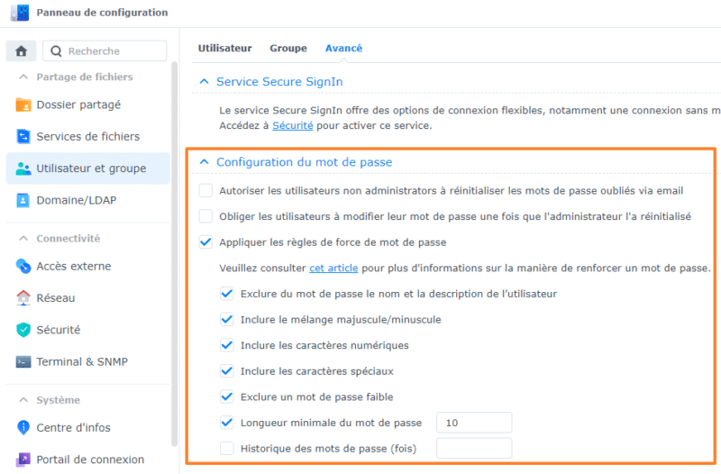 Pour bien définir votre politique de mots de passe DSM, vous pouvez prendre connaissance de mon guide "Politique de mot de passe : comment appliquer les bonnes pratiques de l’ANSSI ?", mais dans tous les cas, je vous invite à cocher les options suivantes pour éviter l'utilisation de mots de passe faibles :