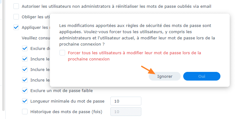 Dès que votre choix est fait, vous pouvez sauvegarder les changements. A cet instant, il vous sera proposé de forcer le changement de mot de passe à la prochaine connexion pour tous les utilisateurs : vous pouvez cliquer sur "Ignorer" pour ne pas imposer le changement du mot de passe.