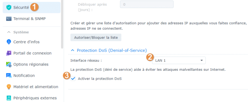 Ouvrez le "Panneau de configuration", cliquez sur "Sécurité" (1), puis sur l'onglet "Protection" sous "Protection DoS (Denial-of-Service)", choisissez l'interface réseau à protéger (2) et cochez l'option "Activer la protection DoS" (3). En fait, vous devez répéter l'opération pour l'ensemble des interfaces réseau de votre NAS, y compris s'il y en a une qui n'est pas utilisée pour le moment. Ainsi, le jour où vous allez l'utiliser la protection sera déjà activée et vous n'avez aucune chance d'oublier ! 🙂