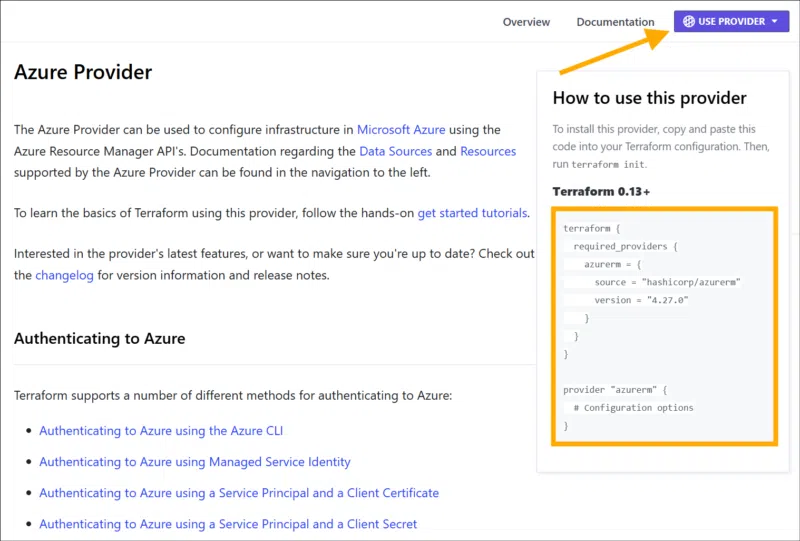 La documentation officielle de Terraform est la meilleure source pour obtenir les instructions à jour concernant un provider. Pour azurerm, elle est accessible ici :