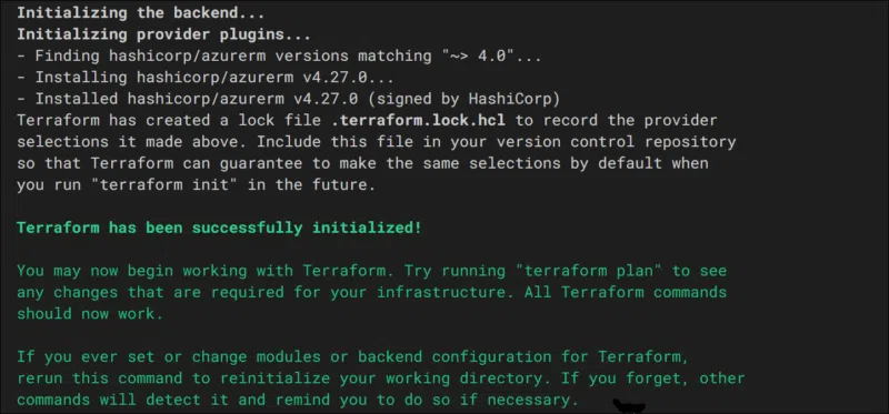 Cette commande initialise un projet Terraform en téléchargeant les providers nécessaires (comme azurerm pour Azure), en configurant le backend de stockage du fichier d’état et en générant un fichier .terraform.lock.hcl pour verrouiller les versions utilisées. Ce dernier fichier permet de garantir que les futures exécutions du projet utiliseront les mêmes versions, assurant ainsi sa stabilité et sa reproductibilité.