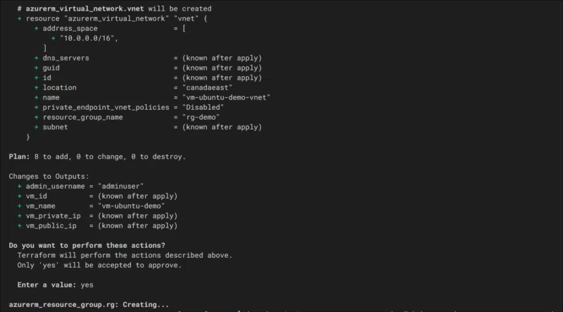 Lorsque tout vous semble conforme, vous pouvez lancer le déploiement avec terraform apply. Terraform va alors parcourir tous les fichiers .tf, calculer un plan d’exécution et vous demander confirmation avant de procéder (Do you want to perform these actions? Enter value: yes). Une fois autorisé à exécuter le déploiement, Terraform se connecte à la plateforme cible (Azure) et il crée chaque ressource définie dans l’ordre approprié : groupe de ressources, réseau, sous-réseau, IP publique, NSG, interface réseau et enfin la machine virtuelle.