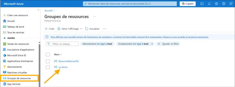 1) Connectez-vous à Azure et sélectionnez Groupes de ressources. Vous devriez voir le groupe de ressources (ici : rg-demo) que nous avons créé via Terraform. Cliquez dessus pour confirmer qu'il contient bien l'infrastructure déployée :