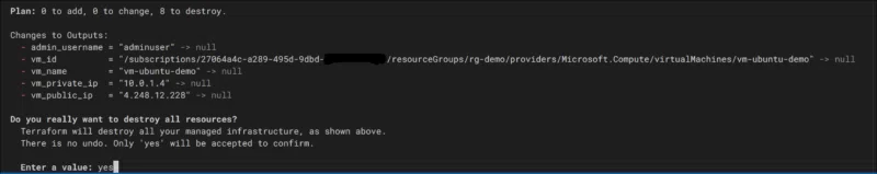 Terraform lit alors le fichier terraform.tfstate pour identifier toutes les ressources qu’il a créées et il génère un plan de suppression que vous pouvez examiner avant confirmation. Une fois validée (Enter a value : yes), la destruction est effectuée de façon automatisée.