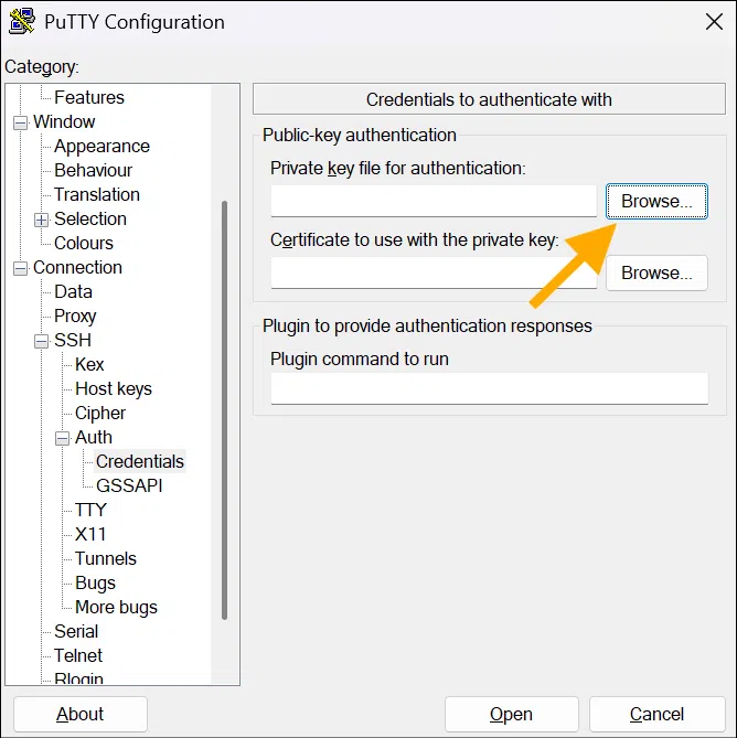 Entrez l’adresse IP dans PuTTY, précisez le nom d’utilisateur et chargez la clé dans la section SSH > Auth > Credentials.