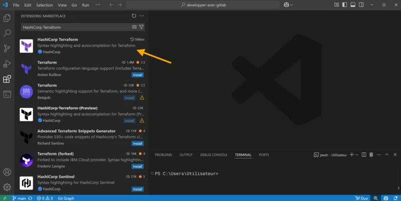2) Dans la barre de recherche, saisissez HashiCorp Terraform.
