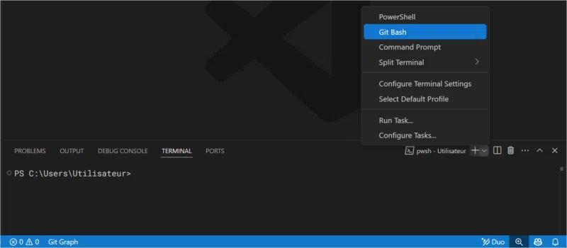 Vous pouvez ensuite cliquer sur + à côté du shell qui s'ouvre par défaut (ici pwsh) pour en sélectionner un autre comme Git Bash :