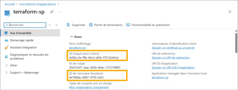 - Application (client) ID : identifiant unique de votre SP = ARM_CLIENT_ID dans Terraform.