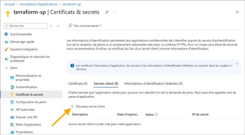 Voici comment créer votre Service Principal et le secret d’authentification en mode graphique :