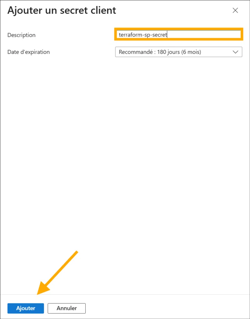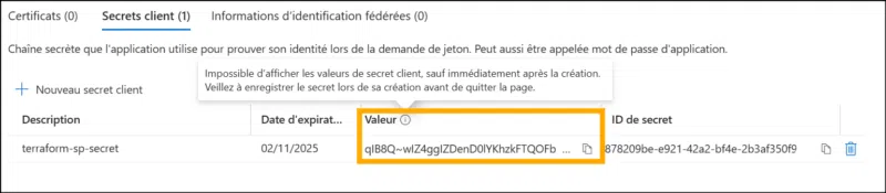 - Client Secret : mot de passe que Terraform utilisera pour s’authentifier = ARM_CLIENT_SECRET dans Terraform.