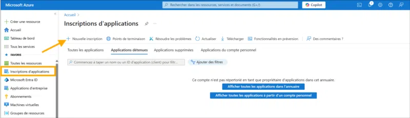 2) Dans la barre de recherche, saisissez Inscriptions d’application (App registrations) et cliquez sur + Nouvelle inscription.