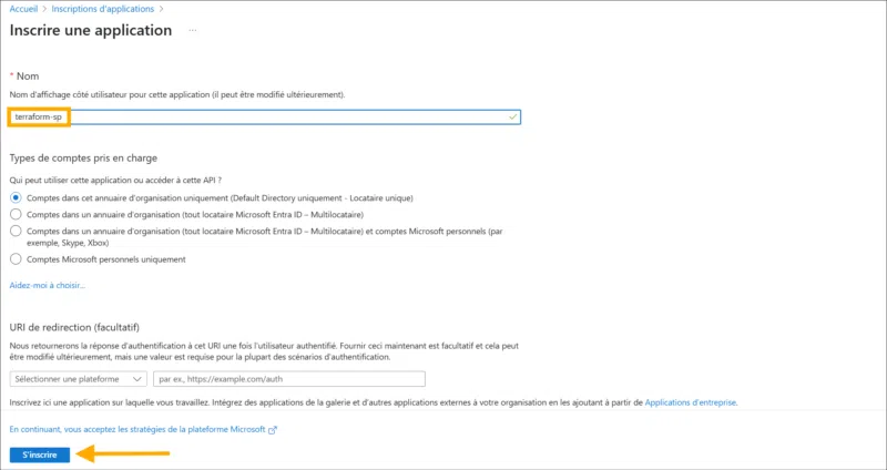 3) Donnez un nom à votre application (par exemple : terraform-sp), laissez les autres options par défaut et cliquez sur S’inscrire.