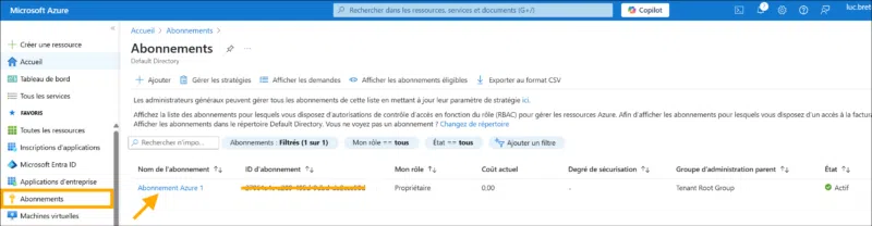 1) Dans le portail Azure, ouvrez la section Abonnements et cliquez sur celui que vous souhaitez utiliser.