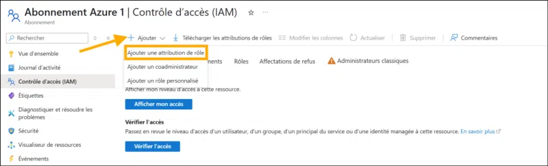 2) Allez dans l’onglet Contrôle d’accès (IAM), puis cliquez sur + Ajouter et Ajouter attribution de rôle.