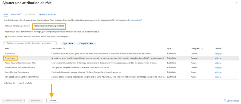 3) Sous Rôles d'administration privilégié, choisissez le rôle Contributeur qui donne les droits nécessaires pour gérer des ressources sans pour autant autoriser la gestion des accès (IAM). Appuyez sur Suivant.
