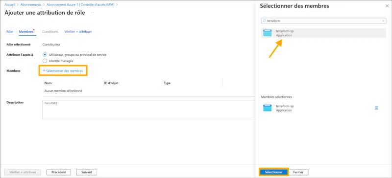 4) Dans l’étape suivante, cliquez sur + Sélectionner des membres, recherchez votre Service Principal par son nom, puis appuyez sur Sélectionner.