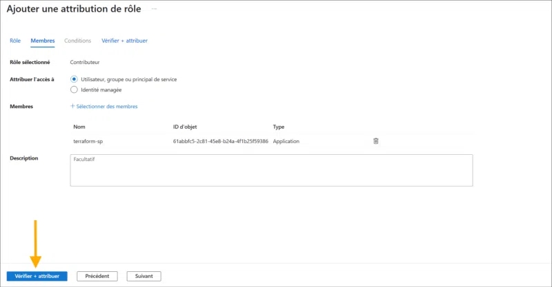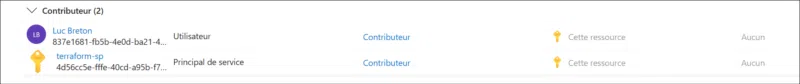 Le rôle « Contributeur » est généralement suffisant pour les déploiements Terraform. Vous verrez votre SP avec son nouveau rôle sous l'onglet Role assignments sur la page Contrôle d'accès (IAM) :