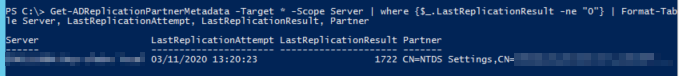 Cette commande va interroger tous les contrôleurs de domaine puisque nous indiquons la valeur « * » pour le paramètre -Target. En complément, nous ajoutons un filtre sur « LastReplicationResult » afin de prendre en compte seulement le cas où il est différent de « 0 ». Autrement dit, si le résultat est différent de « 0 », c’est qu’il y a une erreur !