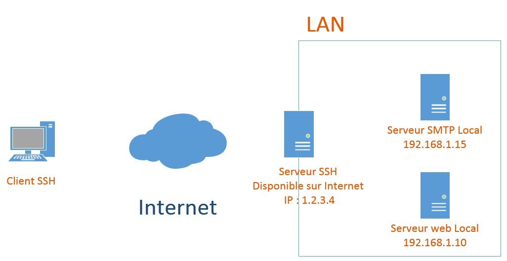 Une possibilité encore plus étendu de l'utilisation du tunnel SSH est le fait d'accéder, au travers un serveur SSH, à une machine qui ne nous est pas directement accessible en tant que client. Pour mieux comprendre, prenons ce schéma :