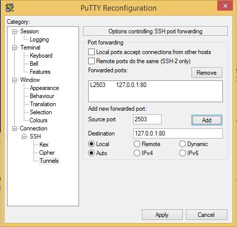 Ici, dans la partie "source port", nous allons spécifier le port local qui sera mappé. Dans la partie "Destination", nous précisons la cible en sortie de tunnel. Cela peut donc, comme nous l'avons vu, être la machine locale (serveur SSH) ou distante avec un port spécifique. Il est à noter que nous pouvons ajouter comme cela plusieurs tunnels SSH. Il faudra valider notre paramétrage via le bouton "Add" puis nous validerons avec "Apply" en bas de fenêtre. Ensuite, nous pourrons effectuer un test en ouvrant un navigateur puis en visant l'URL "http://localhost:2503" :