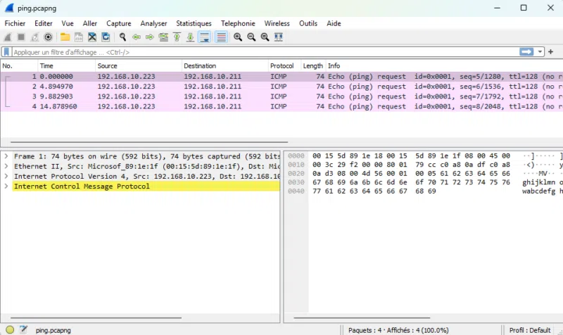 Il ne reste plus qu’à transférer le fichier « ping.pcapng » sur une machine équipée de Wireshark afin de l’ouvrir et effectuer l’analyse.