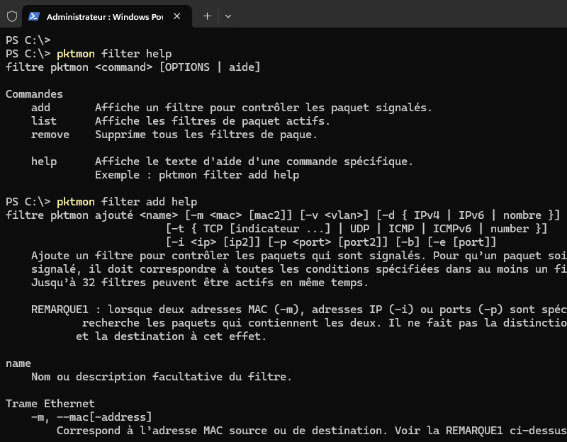 Nous devons donc apprendre à écrire un filtre. Packet Monitor prend en charge jusqu’à 32 filtres actifs en même temps. Au-delà de mes instructions, pensez à consulter l’aide de l’outil puisqu’elle est relativement bien faite. Pour obtenir de l’aide sur l’utilisation de Pktmon, indiquez le mot clé « help » à la fin de votre commande.
