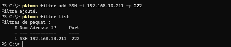 pktmon filter add SSH -i 192.168.10.211 -p 222