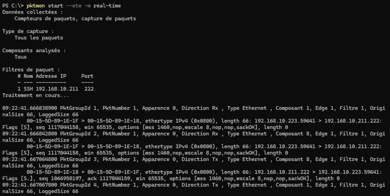 L’outil « Pktmon » dont le nom signifie « Packet Monitor » a été introduit pour la première fois dans Windows Server 2019 et Windows 10 version 1809. Toujours disponible dans Windows 11 et Windows Server 2025, cet outil sert à capturer les paquets envoyés et reçus sur une carte réseau de la machine, mais aussi à détecter les pertes de paquets et à compter les paquets. C’est un outil d’analyse et de diagnostic.