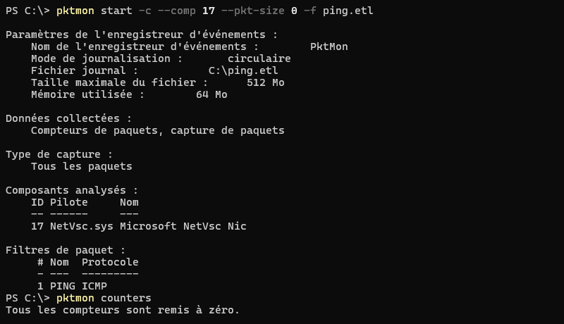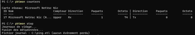 Remarque : pour compter les paquets sans les capturer, utilisez l’option « -o » à la place de « -c ». Par exemple : pktmon start -o --comp 17