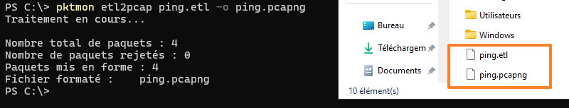 Nous allons prendre le fichier de sortie « ping.etl » créé à l’étape précédente afin de le convertir et obtenir un fichier « ping.pcapng ».