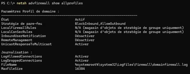 L’outil « netsh » permet de configurer le pare-feu Windows Defender en ligne de commande. Nous n’irons pas jusque-là, mais vous pouvez consulter l’état du pare-feu pour chaque profil avec cette commande :