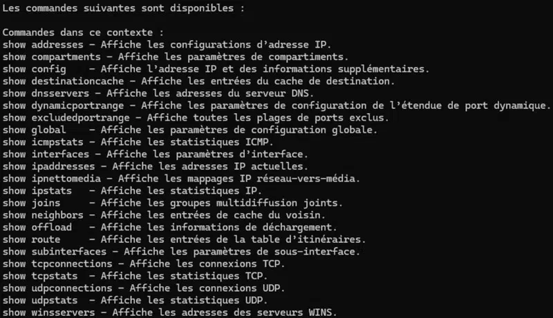 Le jeu de commande « netsh interface ip show » permet d’accéder à de nombreuses options, comme le montre l’image ci-dessous :