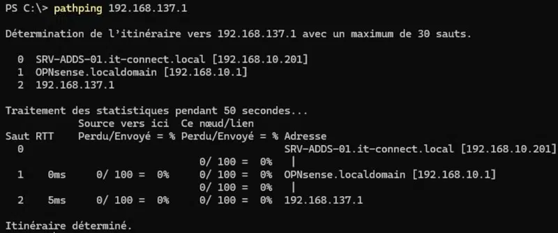 De plus, l’outil « pathping » calcule le « RTT » (Round Trip Time) pour contacter chaque routeur intermédiaire ainsi que l’hôte de destination.