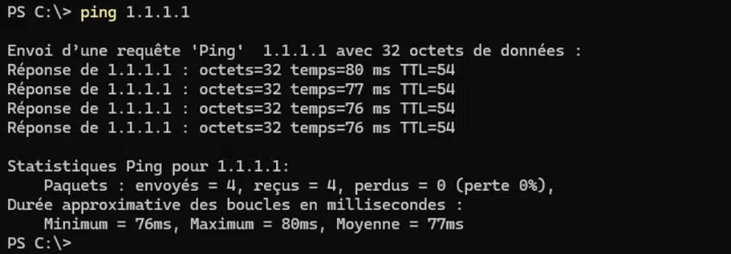 Voici un exemple d’utilisation de la commande « ping » à destination de l’adresse IP « 1.1.1.1 » (un serveur DNS public). Ceci est un moyen de vérifier si la machine peut accéder à Internet. Il suffit de préciser l’adresse IP ou le nom de l’hôte à contacter.