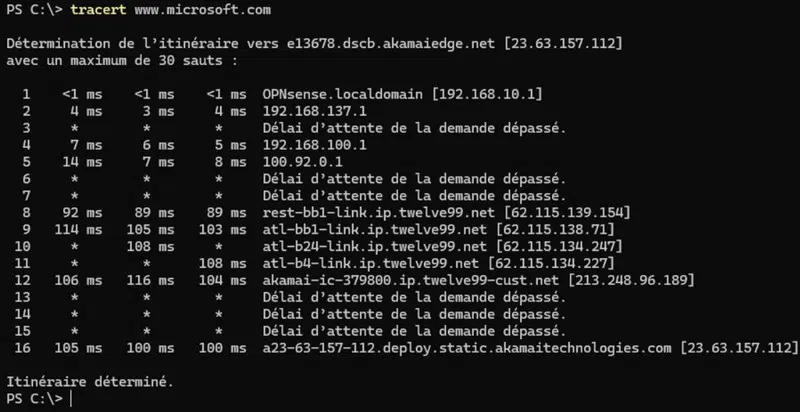 L’exemple ci-dessous sert à effectuer un « tracert » à destination de l’hôte « www.microsoft.com » :