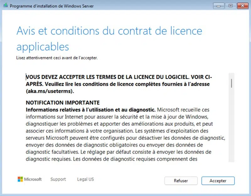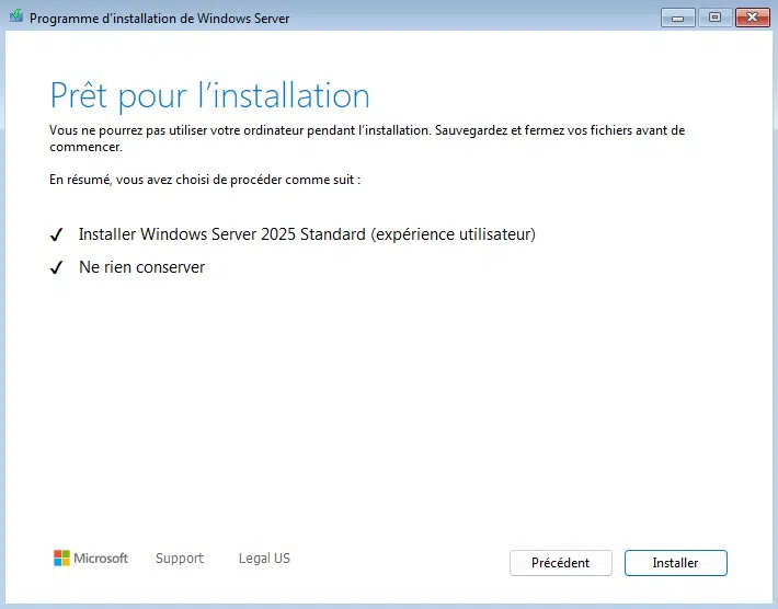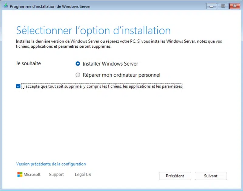 À la troisième étape, cochez les options « Installer Windows Server » et « J’accepte que tout soit supprimé, y compris les fichiers, les applications et les paramètres ».
