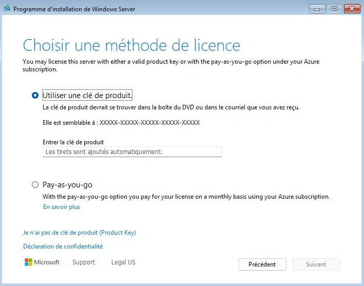 La quatrième étape correspond à la saisie de la licence ou à l’utilisation du mode de paiement à la consommation « Pay-as-you-go ». Si vous n’avez pas de licence, cliquez sur le lien « Je n’ai pas de clé de produit (Product Key) ».