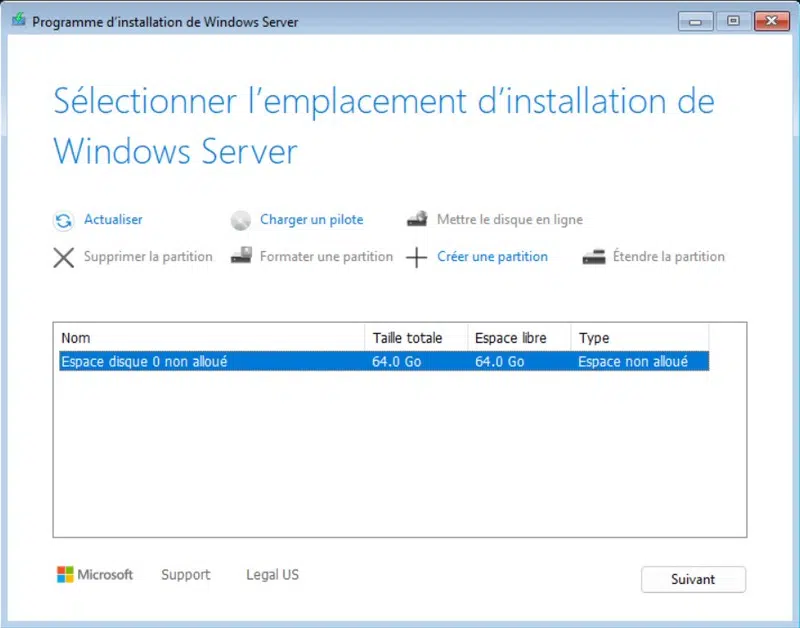 À la septième étape, sélectionnez le disque sur lequel installer Windows Server et cliquez sur « Suivant ». Si besoin, vous pouvez partitionner votre disque.