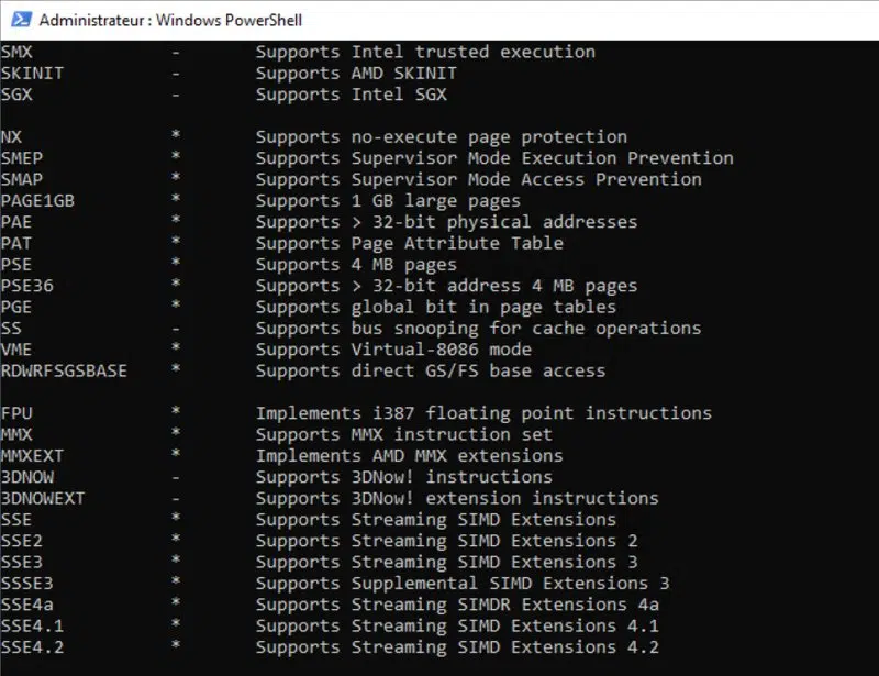 Pour vérifier si votre CPU supporte les fonctionnalités listées dans le précédent tableau, et donc s’il est compatible Windows Server 2025, vous pouvez utiliser l’outil « Coreinfo ». Il s’agit d’un outil gratuit présent dans la suite SysInternals.