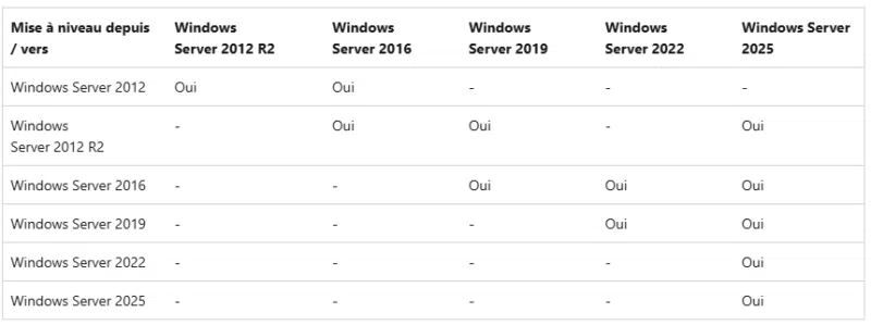 Jusqu’ici, avec Windows Server 2022 et les versions antérieures, il était possible d’effectuer une mise à niveau jusqu'à deux versions supérieures. Par exemple, si vous utilisez Windows Server 2012 R2 vous pouviez passer sur Windows Server 2019, mais pas sur Windows Server 2022.